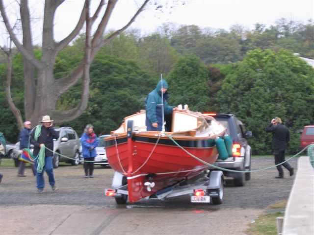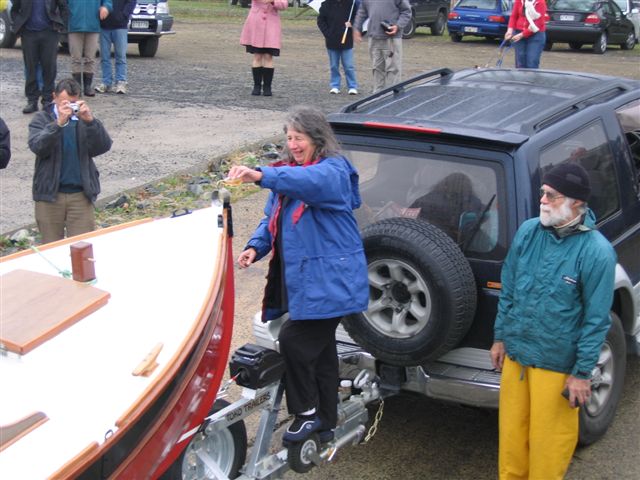 "We had about 80 onlookers, from our various social circles and some who were there anyway, and a friend who played the good old tunes on his Scottish small-pipes, including the Skye Boat Song ("Speed, bonnie boat") as she was launched. Launching involved a miniature of best Scotch. Then we had a brief "sea-trial" on the harbour, while some friends ran a sausage sizzle for the onlookers, which was appreciated on the rather grey day."