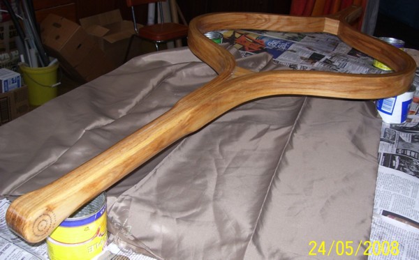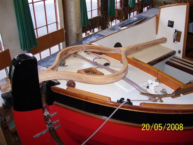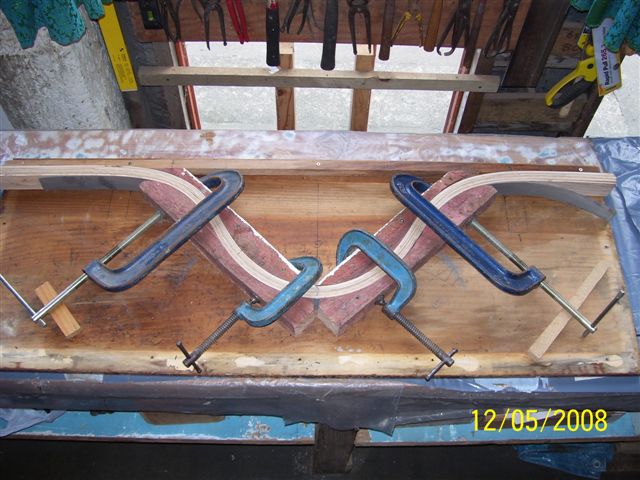 "Here are some photos of my tiller. Each side has seven layers of American ash, cut on the flat grain, 3mm thick, but the rudder end of it had to be trimmed down to six to fit it into the rudder head. I'll lash the wedge in, eventually. In the last photo it has two coats of epoxy on it, and I have put a couple of coats of varnish on it since, with two more to go. It is the first tiller of this style that I have seen, which is the closest you can get to the drawing. As I said on the QT, the drawing has the wrong distance from the rudder head to the position of the mizzen. It should be 16", not 9". The distance between the straight parts is 32". The distance from the CL to the inside of the curve is 11". The curves of mine are as tight as they can be without steaming. A WoodenBoat article about steaming recommends you use freshly cut (green) white oak, which is a total impossibility here."
