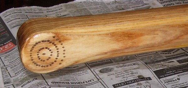 There is a decorative circular pattern of centre-punch dots on the sides of the tiller handle.